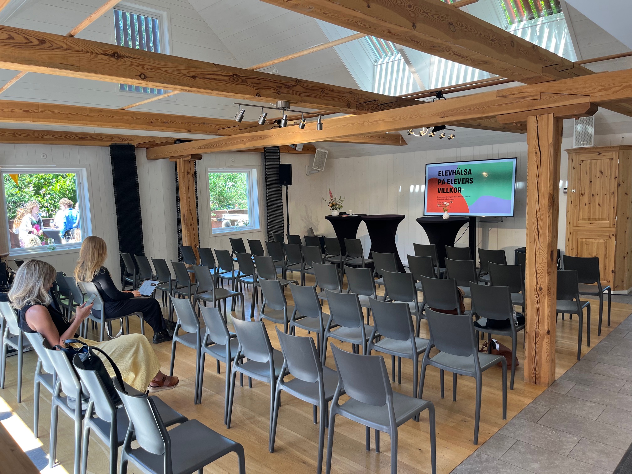 Vår konferenslokal är flexibel och kan möbleras för biosittning, rundabordssamtal, mingel eller middag, allt för att passa för ert event. Fullt utrustat kök finns för att smidigt kunna bereda servering av fika och måltider eller ta emot cateringleveranser. Lokalen är fullt utrustad med porslin, bestick och glas för upp till 65 gäster. För ett slutet sällskap kan man ha med egen mat och dryck. Sommartid är vårt bageri och brunchrestaurang Garveriet öppet i huset intill och ni kan då få fantastisk fika och måltider serverade. Två toaletter finns varav en är anpassad för rörelsehindrade.